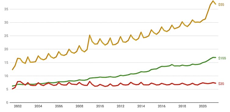 There are far more $50 and $100 notes than there used to be. Twenty years ago we had just six $100 notes per person, alongside about as many $20 notes as now.