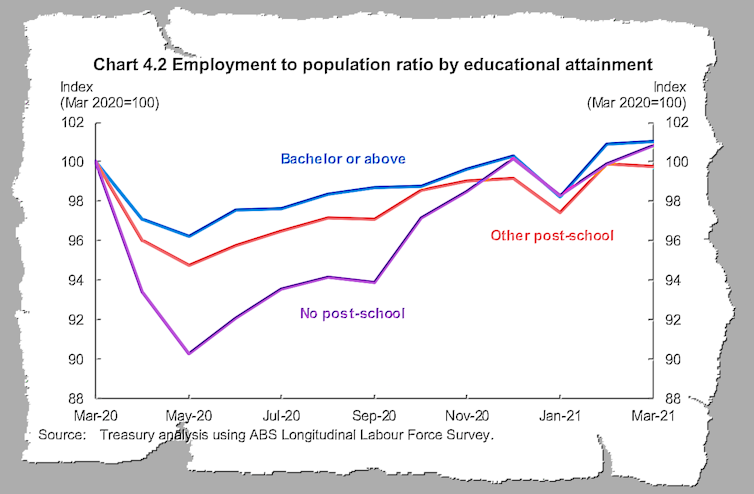 A dramatic budget graph tracking the fortunes of every Australian whose payroll was reported to the tax office throughout 2020 shows the biggest victims of the COVID recession — by far — were those without post-school education. At the deepest point of the COVID recession in May, they were almost three times as likely to have lost their jobs as Australians with degrees.