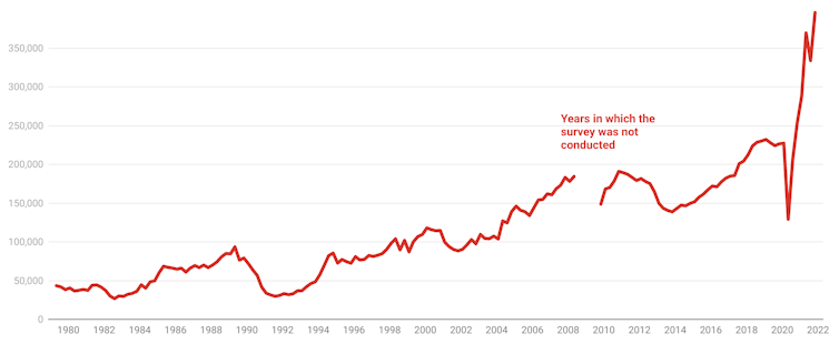 In November, the Bureau of Statistics survey found a record 396,100 jobs on offer, so many as to mean one job for every 1.7 people looking. The more usual ratio, back in the days before COVID, was one vacancy for every three unemployed people looking.
