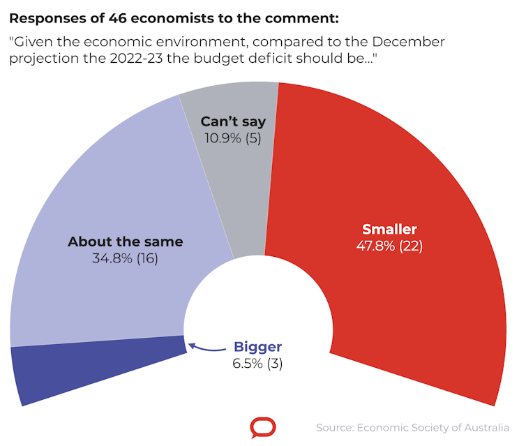 The Conversation’s pre-budget survey of a panel of 46 leading economists selected by the Economic Society of Australia finds almost half want a budget deficit smaller than the A$99.2 billion expected for 2021-22 and the $98.9 billion forecast for 2022-23 in the December budget update.